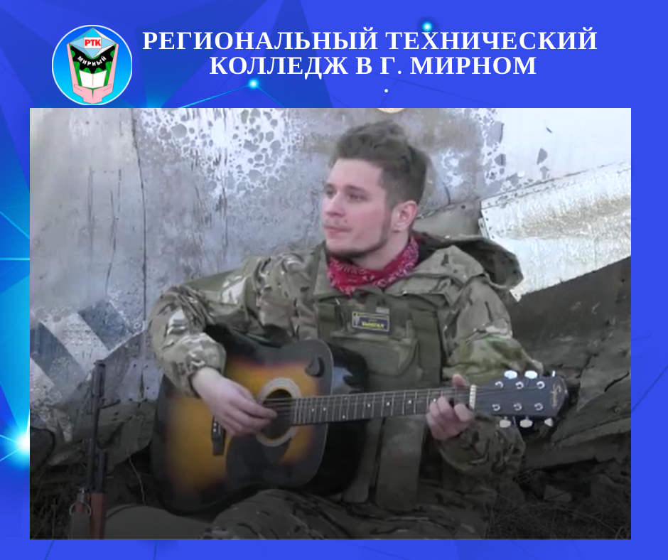 Студент группы МА-18/9 "Регионального Технического Колледжа г. Мирный" Илья Шикуля ко Дню Победы исполнил известную песню военных лет "В землянке" на слова Алексея Суркова, музыка Константина Листова. Оператор - Монтажер: Владимир Сюсин Съёмочная группа благодарит: - Евгения Мерушева, руководителя Военного патриотического клуба "Вымпел-Якутия" "Регионального Технического Колледжа г. Мирный" - за помощь в предоставлении амуниции. - Дюлустана Еремеева, руководителя страйкбольного клуба "Единство" г. Мирный за предоставления видео и страйкбольного автомата Калашникова G&G RK-47. - Владимира Харлампьева, руководителя автошколы ГАПОУ РС (Я) «МРТК», за предоставления автотранспортной техники. Спасибо за внимание! г. Мирный 9 мая 2021г. Фёдор Петров, художественный руководитель ГАПОУ РС (Я) "Региональный технический колледж в г. Мирный".