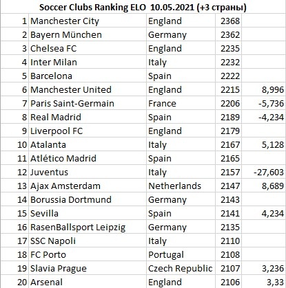 Рейтинг футбольных команд мира ELO по состоянию на 10.05.2021 (в рейтинге высшие лиги 85 стран, добавлено 3 страны)