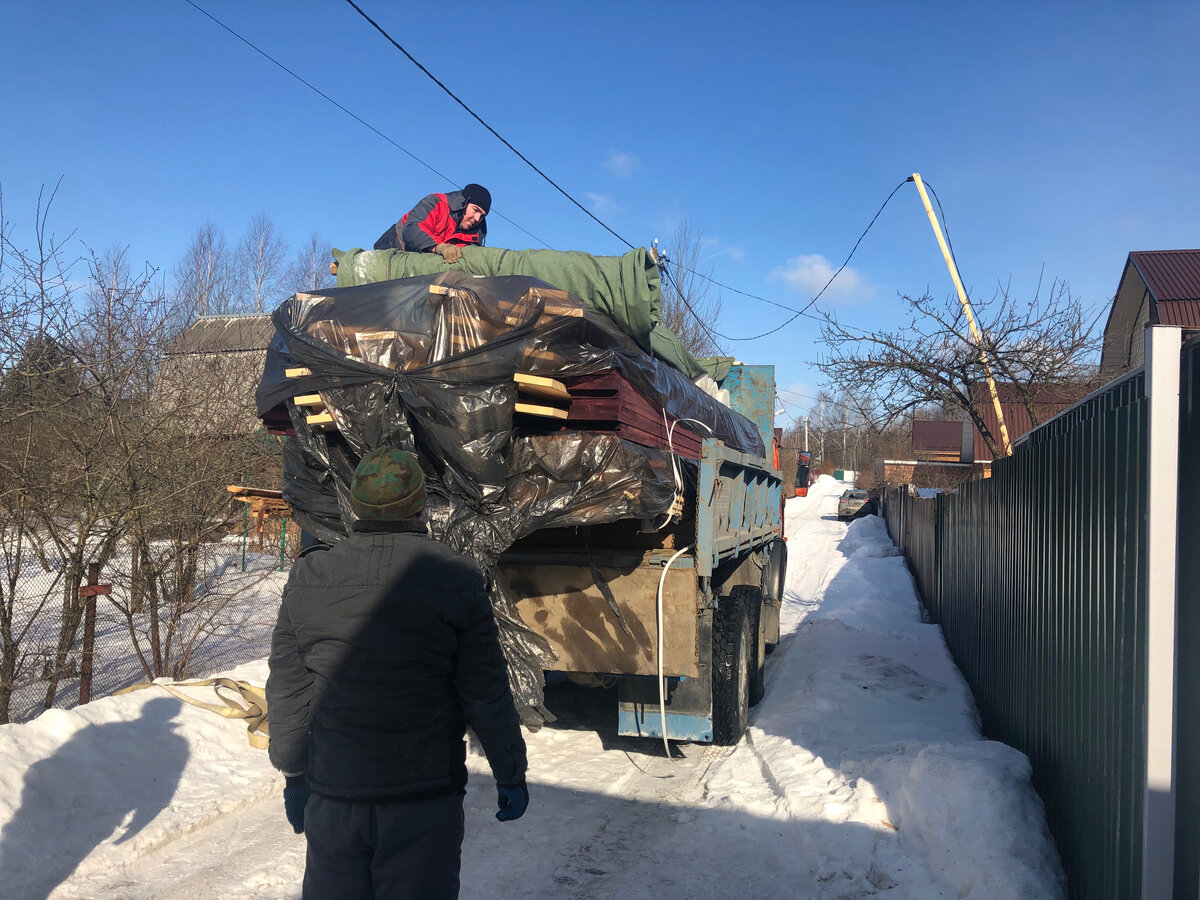 Приехала бригада из 4 человек. Вместе с ними приехали 3 Камаза с частями дома. Вместе со строительным материалом приехала времянка для рабочих. Перед приездом бригады надо было расчистить территорию от снега. В 10 утра они начали разгружать и закончили только поздно вечером. Спасибо, что дочитали статью до конца! Задавайте вопросы в комментариях, постараемся всем ответить :)