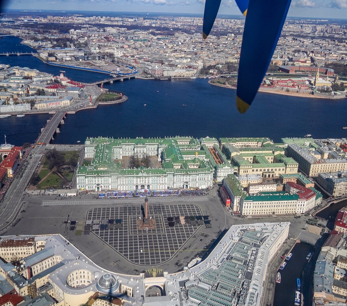 В День Победы в Санкт-Петербурге неожиданно прекратились дожди и у нас есть возможность показать, как выглядит полет с борта парадного Ан-12. Под нами — Дворцовая площадь с парадными расчетами и техникой!
