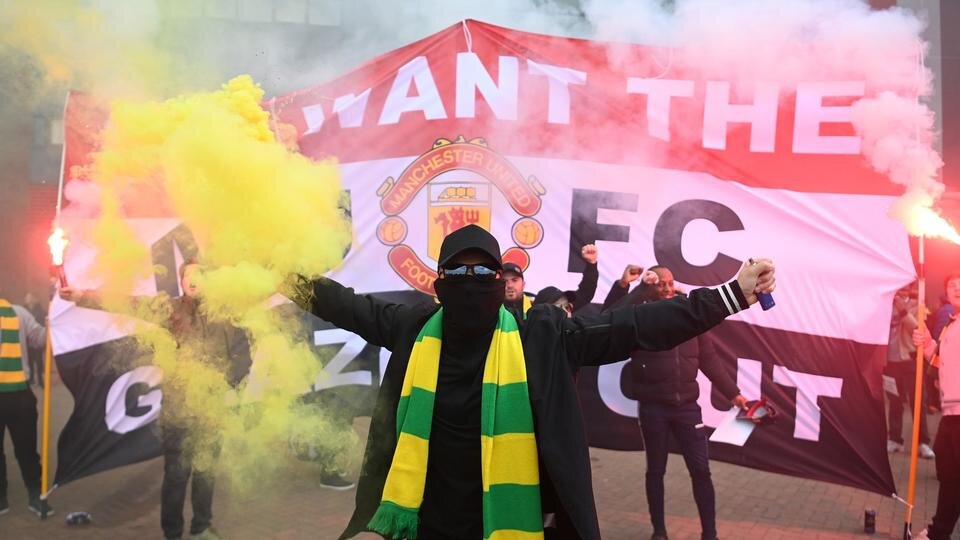 Болельщики «Манчестер Юнайтед» протестуют против владения семьей Глейзеров клубом у стадиона «Олд Траффорд» в Манчестере в четверг, 13 мая, всего за несколько часов до перенесенного матча Премьер-лиги против «Ливерпуля». Матч, который первоначально был запланирован на 2 мая, был отложен после того, как аналогичная акция протеста, проведенная фанатами манкунианской стороны против владельцев клуба в США, и провалившийся проект Европейской суперлиги превратился в вторжение на поле за несколько часов до начала игры. Это был первый матч Премьер-лиги, который был отложен из-за поведения болельщиков. В понедельник, чтобы предотвратить будущие беспорядки во время подобных протестов, клуб усилил охрану вокруг стадиона, установив три стальных кольца перед юго-западным углом, куда ворвались болельщики. Подписывайтесь на канал Рупор Москвы в Telegram, Яндекс.Дзен чтобы быть в курсе последних событий.