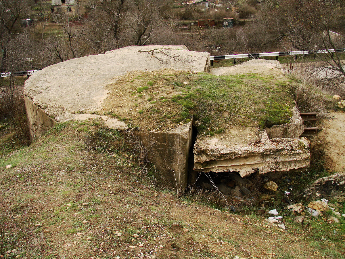 Дот № 21 Расположение: Над Лабораторным шоссе Описание: Нестандартный дот под морскую 45мм пушку 21К, нормальных габаритов (5,5х5,5м). Левый вход в сквозник выполнен в виде верхнего люка, а короткий, крытый бревнами ход сообщения из левого сквозника дота вел в блиндаж. На бетоне видны отпечатки бревен, диаметром около 150мм (в два наката) Амбразура имеет сильную клиновидность, что диктуется рельефом местности. Вероятнее всего, амбразура закрывалась заслонками (сохранились петли). Дот имеет множественные мелкие повреждения и следы подрыва. Фундамент орудия стандартный: стальная плита 80х80см с 16-ю анкерами. Дот был оснащен 45мм орудием учебной батареи ВМУБО им. ЛКСМУ (№ В610 1-я категория) Боевое применение дота описано в воспоминаниях Н.Г.Шемрука и И.Ф.Игнатьева. Дот, был взорван командиром вместе с собой, при приближении румынских войск На крыше дота имеется надпись, которая, вероятнее всего, является номером и датой окончания строительства («14/IX/1941 20»). Дот расчищен отрядо