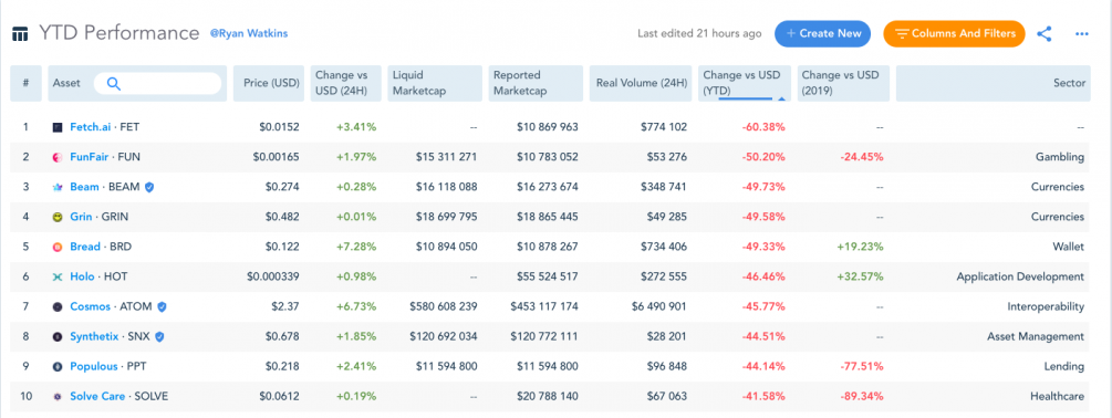 В пятерке по доходности в текущем году не оказалось ни одной крупнейшей по капитализации монеты. Наихудшую динамику продемонстрировала Fetch.ai, за последние 3,5 месяца она потеряла 62% от цены Криптовалюта Hedera Hashgraph показала наилучшую доходность среди цифровых денег с начала 2020 года. По информации стартапа Messari, с января ее курс вырос на 214%. Также в пятерку по прибыльности вошли проекты Streamr (185%), Datum (168%), Numeraire (163%) и Kyber Network (149%). IEO-проект Fetch.ai возглавил список альткоинов с худшей динамикой. С начала текущего года он потерял 62% от цены. Также сильнее других пострадали Bread (-53%), FunFair (-51%), Grin (-50%) и Beam (-50%). Курс биткоина за последние 3,5 месяца снизился на 4%, до $6900. Курс Ethereum за тот же промежуток времени поднялся на 22%, до $159, цена XRP опустилась на 3%, до $0,187. Токен Ripple подешевел на 95% c исторического максимума в $3,80, который был установлен в январе 2018 года. В то же время Ethereum потерял 89% от цен