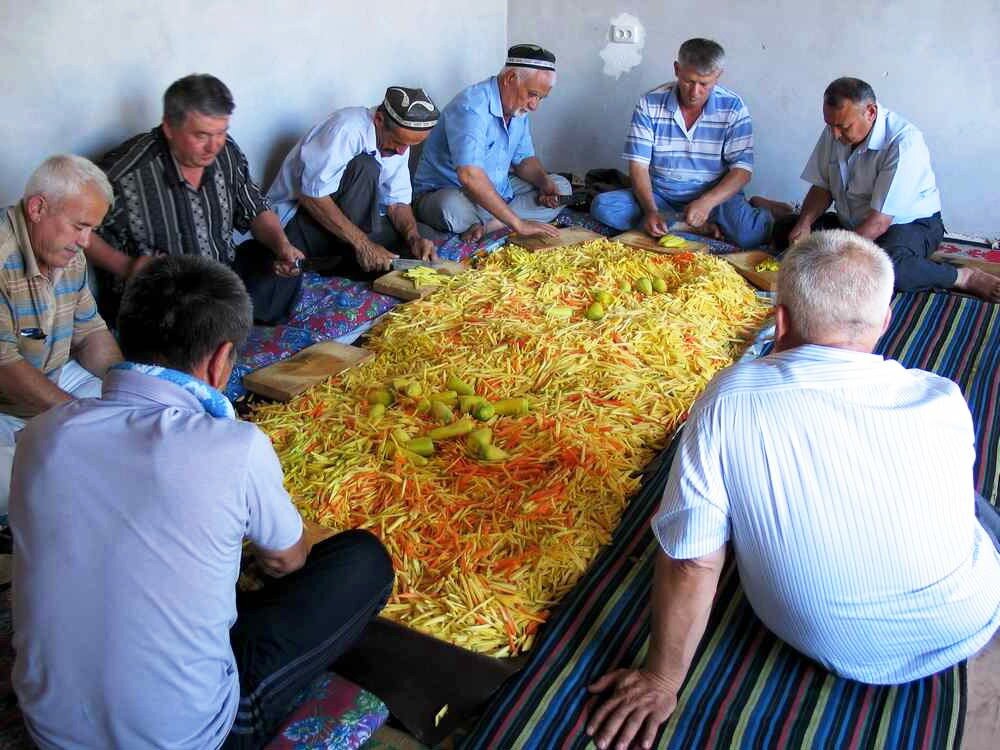 Будучи родом из Ташкента, предыдущие 20 лет я там не жила, но вернувшись, каждый день открываю для себя всё новые и интересные вещи. А иногда вспоминаю давно забытые, ещё более интересные. Приглашение на «утренний плов» – обряд, проводимый в честь определённого торжества: свадьбы, рождения ребёнка, юбилея, поминок и прочих важных событий. Вечером накануне проводится ритуал "сабзи туграр". Приходят близкие родственники и соседи, для того чтобы помочь организовать торжество. Обязанности при этом распределяются. В каждом регионе ритуал проходит по-своему, но у нас в Ташкенте это настоящий праздник с присущим тому настроением. Помимо оказания помощи в виде чистки, резки моркови и лука, перебирания риса, разделки мяса и прочих забот, люди общаются, веселятся и обсуждают насущные вопросы. На столе в это время стоят всевозможные угощения: самса, сладости, закуски, лепёшки, напитки – всё несказанно вкусно. После труда за дружеским столом, все едят шурпу. Приглашают артистов и певцов. Время