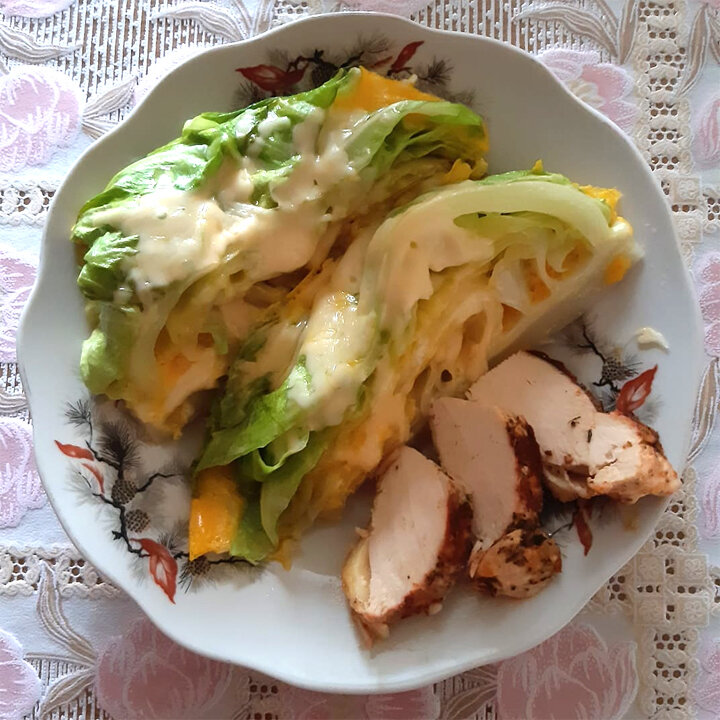 Я недавно с диагнозом, и наша группа для меня - замечательная находка! Получаю большую помощь от участников, которые делятся своими рецептами и драгоценным опытом! Решила и я показать свой сегодняшний завтрак. Это шницель из молодой капусты с яйцом и сыром (говорю сразу, сыр 30%) на сковороде и куриная грудка с прованскими травами. Кочерыжку не вырезала специально, чтобы было понятно как резалась капуста, чтобы не распалась на листики. Рецепт: Небольшой кочан молодой капусты режу по кочерыжке на восемь частей и выкладываю на разогретое масло (у меня оливковое) в сковороду. Накрываю крышкой и пропекаю пять минут с одной, и пять минут с другой стороны. Затем снимаю крышку и даю выпариться жидкости, если есть. Затем солю и заливаю двумя взбитыми яйцами, посыпаю натёртым сыром, прикрываю крышкой и жду, когда яичная смесь схватится. Вот и весь рецепт, быстро, вкусно и полезно! А в качестве белковой добавки - запечённая вечером куриная грудка. Приятного аппетита! Больше общения и рецепт