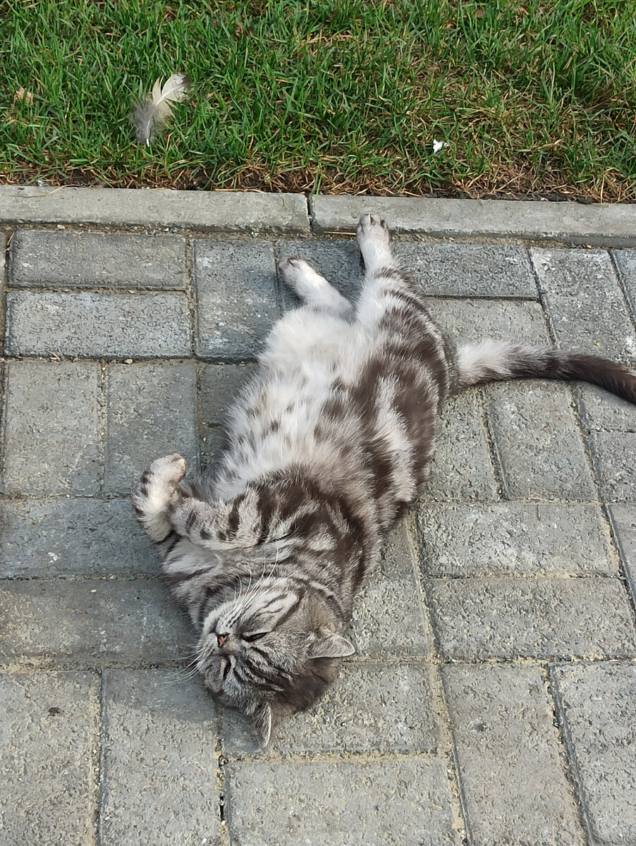 Симбону сделали выгул, парень спал как убитый на самом солнцепёке. Мне обрадовался, сразу встал и пошёл за мной в гараж, там прохладненько было, упал возле сетки кверху пузом, чтобы тётка его чесала. Отказать царю просто невозможно, пришлось чесать))) Когда я пошла дальше, Симбуля вернулся на старое место, чуток пгремел миской, попил и снова упал. Наш лев универсал, в холод ему не холодно, в жару - не жарко))))))