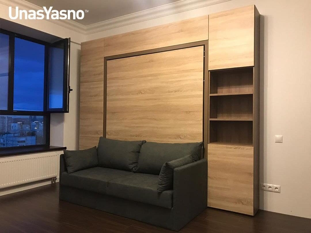 В этой статье хотим познакомить вас с линейкой мебели трансформер UNASYASNO от OLISSYS ™ В этой серии мы постарались создать изделия максимально доступные по цене, сохранив высокое качество, функциональность и компактность. На фото представлена меблировка комнаты мебелью UNASYASNO. Все предметы подобраны в едином стиле. Фасады с фактурой натурального дерева великолепно сочетаются с тканью дивана и цветом пола. Системы хранения, включая шкаф-кровать в собранном виде, имеют глубину 327мм, что значительно экономит пространство. Модуль трансформер способен за несколько секунд превратить вашу гостиную в уютную спальню. Давайте посмотрим цены на предметы мебели, входящие в данный комплект: Модуль со спальным местом 160 - 77 500 (без матраса) Антресоль модуля с 1 фасадом - 2 шт - 18 000 (36 000 - за 2) Диван - 37 500 Платяной шкаф с выдвижными ящиками- 3 шт - 38 000 (114 000 - за 3) Книжный шкаф с распашными дверцами - 30 500 Функциональная тумба стол 180 - 21 000 Откатная тумба с выдвижными