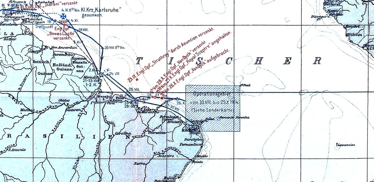 К этому моменту, как пишет Корбетт: "...Новым районом операций командир «Карлсруэ» избрал путь торговых судов между Нью-Йорком и Южной Америкой в 300 милях от своей прежней позиции....".