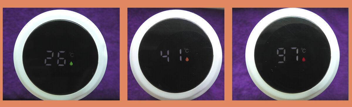 Давненько я присматривался к нему и так он мне понравился. Реализована очень занятная идея когда на крышке отображается температура, причем индикатор как бы предупреждает когда вода холодная, теплая, кипяток и показывает текущий нагрев в градусах. С первого взгляда может показаться, что корпус сделан из пластика и даже в руках ощущается как пластик, но нет. Это особо окрашенный металл. Если постучать чем-то стальным то отчетливо слышен звук удара металла о металл и на крышке видны мелки вмятины как на листовой стали. И нет нет, это не после ударов, а похоже крышка сначала получила нежелательный рельеф и уже потом слой краски. Материалом внутренней колбы заявлена нержавеющая сталь марки 304 которая, по информации из сети является кислостойкой и кратковременно держит нагрев аж до 900 градусов по Цельсию. Что-ж, это отличный выбор для термоса, вот бы еще анализатор спектров был под рукой, а так да, очень похоже на нержавейку и как минимум не видно следов ржавчины. Вначале я решил прове