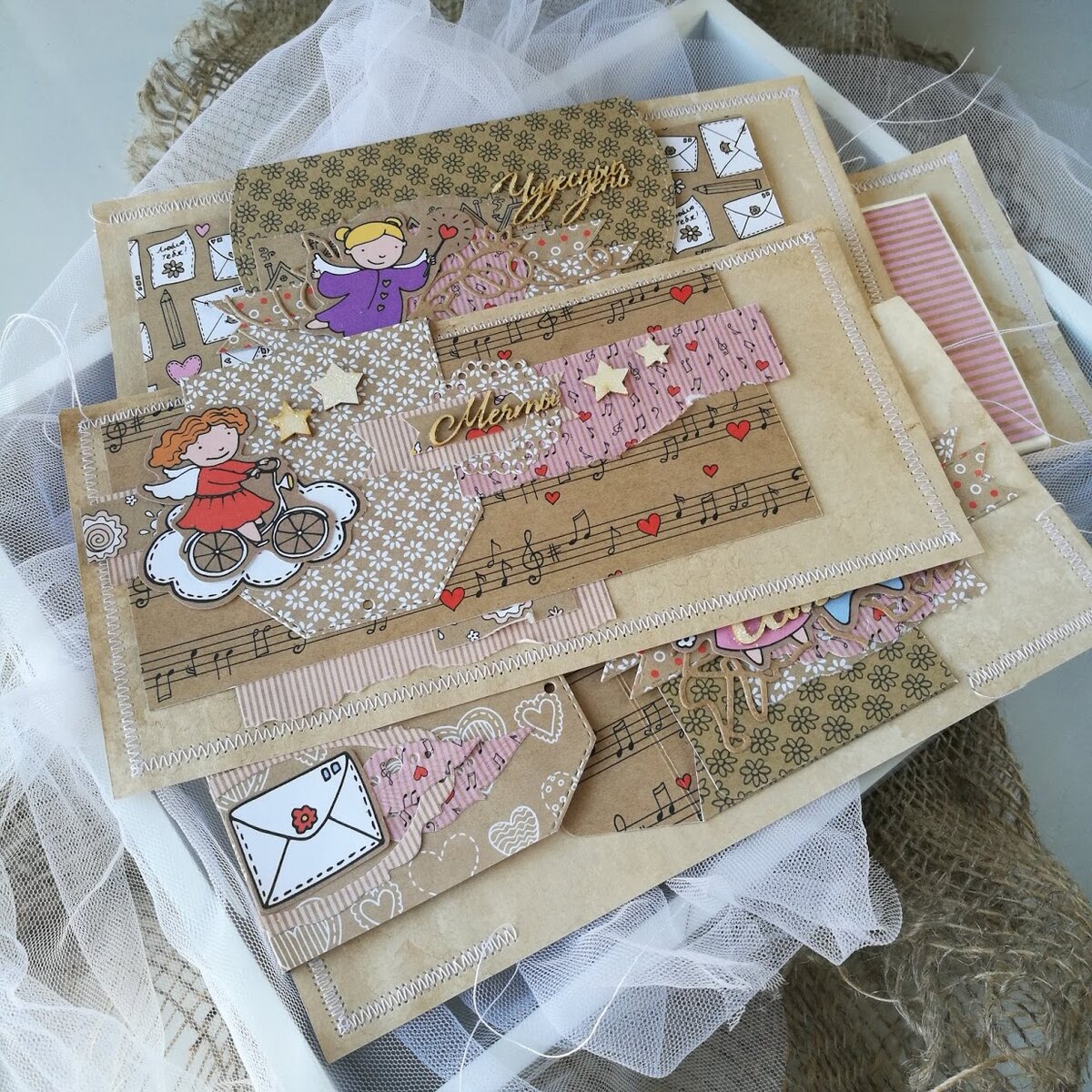 Это детский альбом небольшого размера для девочек, прекрасно подойдет для домашних фото или фото из детского сада. Альбомчик с раскладушками, секретиками, конвертиками. Предназначен для фото размером 5х7.5 см, это половинка стандартного фото 10х15 см. В альбоме использовала бумагу и высечки известного российского производителя #mr.Painter , коллекция "Простые чувства". Обложка из хлопка двух расцветок, завязывается альбом на ленты. Если вы еще не видели видео альбомчика, то можно посмотреть тут: В качестве основ для страничек я использовала бумагу ручной окраски, красила страницы крепким кофе. Получился интересный эффект, окрасились страницы с плавными "переходами". По периметру страницы прошивала "зигзагом" на швейной машине. Теперь можем посмотреть и сами развороты. Их всего четыре. На верхней страничке фото вставляются в кармашек, можно вместить несколько штук. На нижней страничке фото помещаются на раскладывающуюся конструкцию... Получается можно вместить 4 фото. Держится "раскла