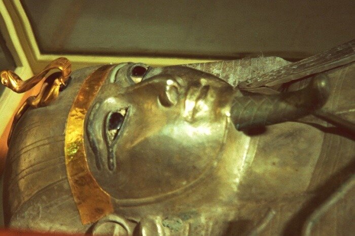 Когда и этот саркофаг вскрыли, оказалось, что от мумии правителя ничего не осталось: кости, труха и обилие драгоценных украшений на руках, ногах и груди покойного.