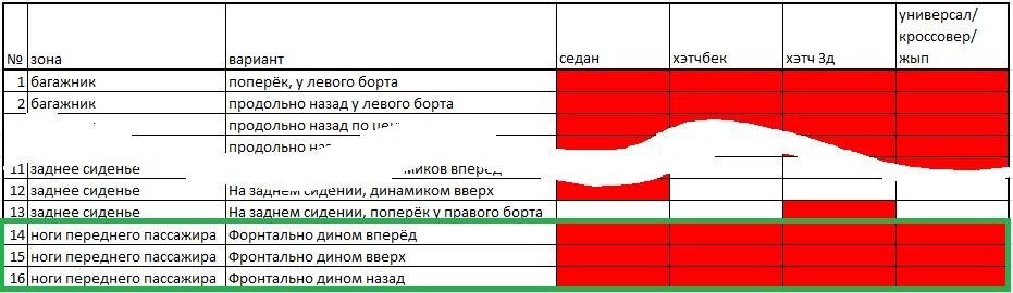 Напомню, что в каждой из 14 машин мы старались исследовать три варианта направления сабвуфера, размещенного в ногах переднего пассажира.