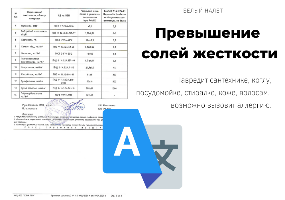 Ура! Конкретный анализ воды, в основе которого кальций и магний. Здесь уже не нужно догадываться. Ведь именно он является главное причиной всех проблем. Это тот самый белый налёт из-за которых столько бед: