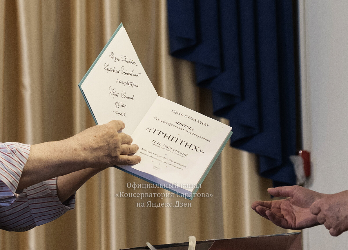 Народный артист СССР, профессор Юрий Иванович Симонов, которому в этом году исполнилось 80 лет, провёл день 6 мая в плотном графике. Утром состоялась творческая встреча со студентами и преподавателями в Малом зале, а затем, после небольшого перерыва, большая дневная репетиция в Большом зале с симфоническим оркестром. Рады представить вам фотографии 4 дня пребывания выдающегося музыканта в Саратовской консерватории. Юрий Иванович подарил библиотеке СГК имени Л. В. Собинова свою книгу с дарственной надписью «В дар библиотеке Саратовской государственной консерватории. Юрий Симонов. 7/V 2021 г. Саратов.» Этот снимок для меня - большая память. Перед началом репетиции Юрий Иванович позвал меня на сцену и предложил сделать художественный кадр, который он сам выстроил: это все партитуры, с которыми он работал во время репетиций, дирижёрская палочка, карандаш. И всё это разложено на рояле самим маэстро. С отражением части красивого потолка зала и света от лампочек на лакированной поверхности ин