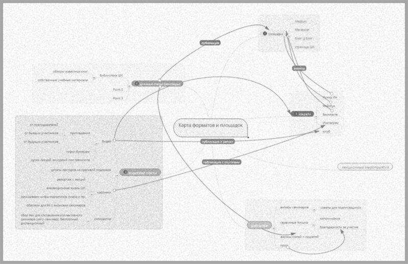 После составления контент-стратегии нужно заполнить карту форматов. По нашему опыту, самый удобный способ для этого – ментальные карты, которые наглядно покажут иерархию материалов и способы дробления. Так, тизер с инфографикой может привести читателя в лонгрид, который в свою очередь приведет в кейс на сайте, где и ждет наше сокровище! Но нужно понимать, что это не маршрут пользователя и не карты точек соприкосновения. Карта форматов — это как детальки конструктора, разложенные по порядку. И из этих деталек еще предстоит сложить что-то цельное.