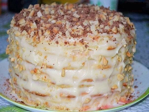 Тесто 1 яйцо 200 гр творога 1 ст сахара ванилин примерно 300 гр муки 1 ч л гаш соды. Крем 500 мл молока 1 яйцо 1 ст сахара 3 ст л муки ванилин 150 гр слив масло. Орехи 150 гр. Приготовить основу крема растереть яйцо с сахаром и мукой, добавить ванилин, влить молоко, перемешать венчиком, поставить на медленный огонь, варить до загустения, постоянно мешая. Полностью остудить. Творог перетереть с сахаром, яйцом, добавить ванилин, соду и постепенно ввести муку. Тесто должно получится не совсем крутым, но плотным. Разделить его на 6-8 частей (смотря какой диаметр сковороды). Тонко раскатать, наколоть вилкой, чтоб не вздувались. Печь до зарумянивания на сухой сковороде с 2х сторон. Обрезать неровные края. Остудить. Сл масло взбить миксером, постепенно добавляя заварную массу холодную. Смазать коржи, пересыпая орехами(по желанию). Сверху украсить крошкой от обрезки коржей, орехами и тертым шоколадом. Оставить пропитываться не меньше, чем на 6 часов. Не забудьте подписаться!
