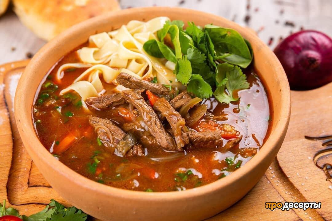 Ингредиенты: 800 гр длинной вермишели 700 г мяса 2 крупные луковицы 2-3 моркови томатная паста или 3-4 помидора 4-5 картофелин 4 ст. л. растительного масла соль черный молотый перец укроп, петрушка, розмарин, базилик. Приготовление: В казане на растительном масле пассеровать до прозрачности мелко порезанный лук. Мясо порезать небольшими кубиками и обжарить с луком. Добавить мелко порезанную соломкой морковь и обжарить. Добавить томаты, потушить 5 мин. Залить 1,5 л воды, закипятить, затем уменьшить огонь, посолить, поперчить, накрыть крышкой и варить 15 мин. Картофель порезать небольшими кубиками, добавить в соус и варить до готовности. Добавить мелко порезанную зелень, лавровый лист, закрыть крышкой, снять с плиты и дать настояться 10 минут. Отдельно в подсоленной воде отварить необходимое количество спагетти, воду слить, промыть холодной водой, разложить в порционные тарелки и залить соусом. Приятного аппетита!