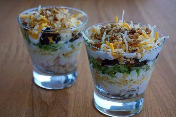 Теперь нужно выложить салат слоями в порционные вазочки. Выкладываем в такой последовательности: курица, яйца, огурцы, чернослив, орехи, сыр. Между каждым слоем кладем заправку из майонеза и йогурта. Перед подачей ставим салат в холодильник на 1 час.