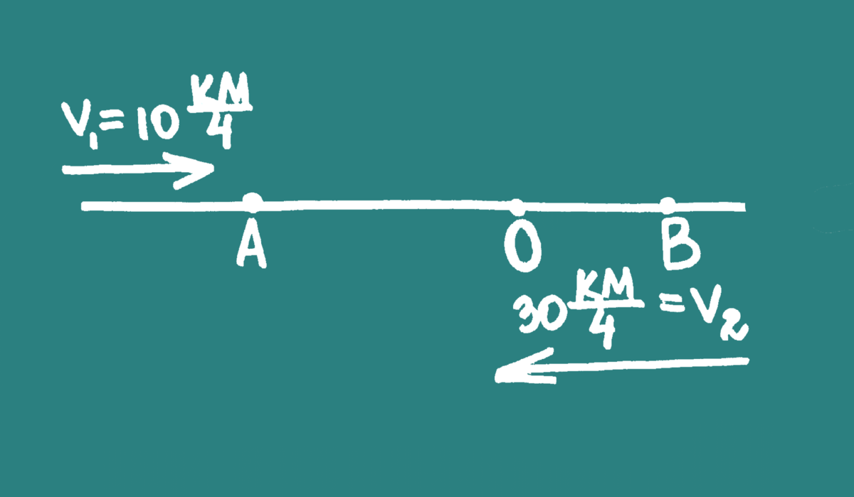 Место встречи двух велосипедистов я обозначила буквой О. Нас просят найти расстояние от города В до места встречи. На рисунке этому расстоянию соответствует отрезок ОВ. В задачах то, что нужно найти, обозначается за «Х», поэтому пусть ОВ = Х.