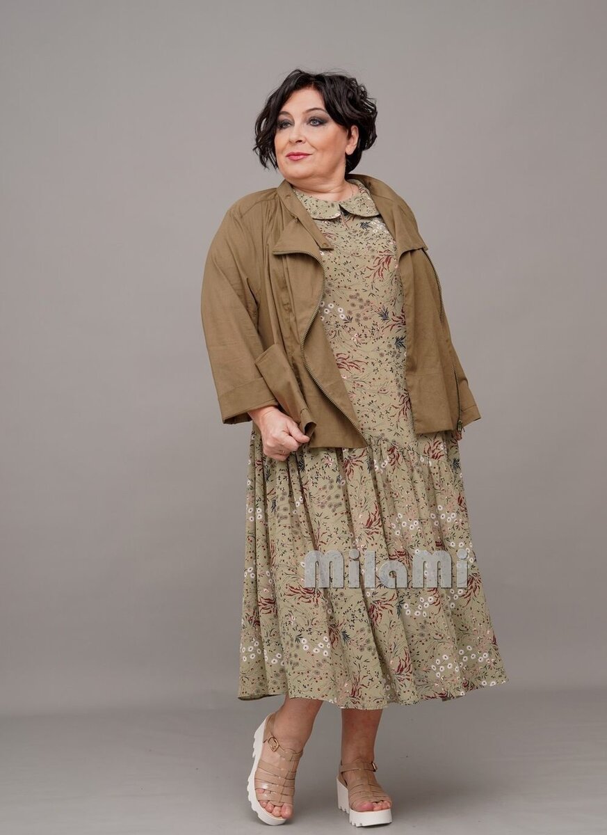 1. Ансамбль в бежевых тонах. Платье длиной до середины голени сшито из ткани с принтом. Платье с заниженной талией. Лиф прямого силуэта, линия разделения лифа и блузки проходит по диагонали. Юбка расклешенная. К платью выбрана светло-коричневая куртка-жакет.