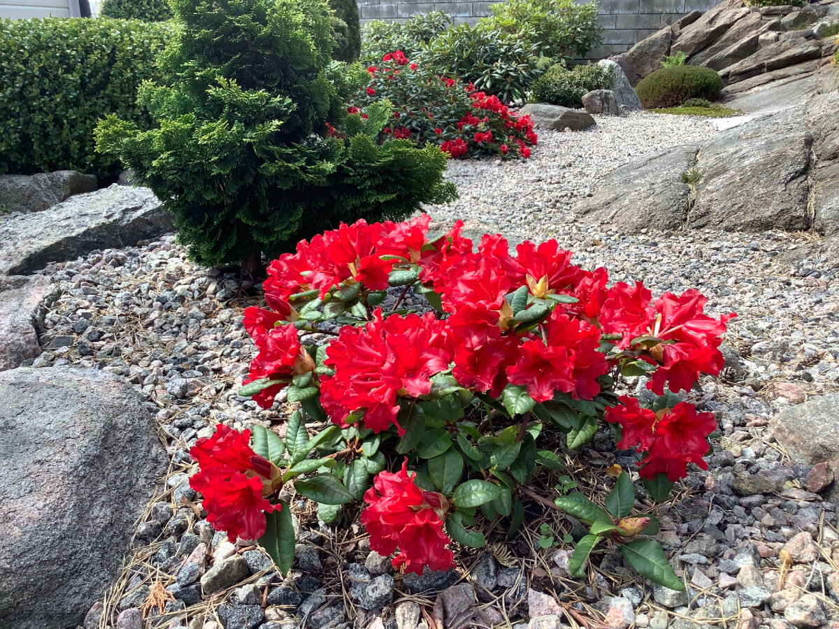 Середина мая - время цветения всех красных рододендронов, которые растут у нас в саду. Ползучие рододендроны «Baden Baden» - самые большие из красных сортов нашего сада. В диаметре они уже больше одного метра. Кустам около десяти лет. Рододендроны, растущие в более теневой части сада распускаются чуть медленнее, но это даже и хорошо, любоваться цветением можно подольше Также цветут два небольших кустика «Scarlet Wonder». Что ещё есть красного или почти красного в саду?