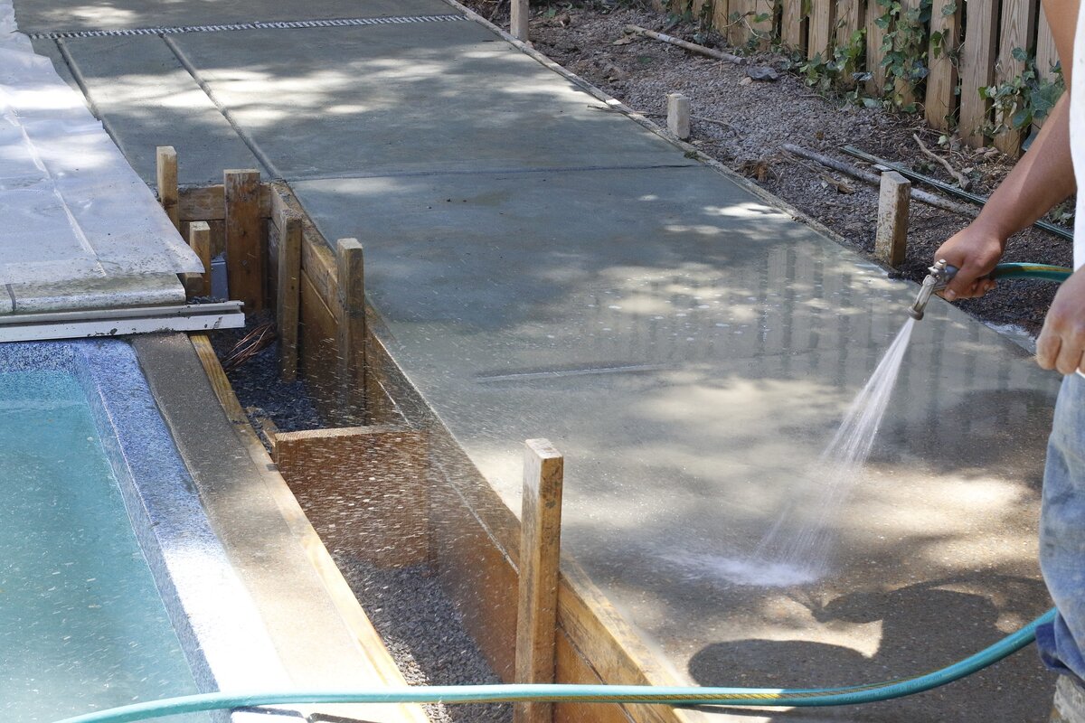 ✅ На протяжении первых 14 дней после укладки бетона нужно непрерывно поддерживать влажность поверхности, периодически поливая ее водой. Если влага полностью испарится из искусственного камня, его обезвоженная структура станет недопустимо хрупкой.