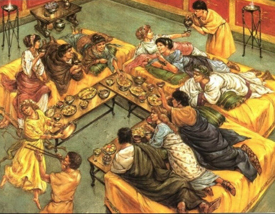 Конечно сидя, ответят большинство читателей и ... ошибутся. Каждый, кто ел и смотрел программы ТВ на диване, вам ответят, что лежа гораздо удобнее и приятнее. Античные римляне ужинали лежа. Или лучше сказать - полулежа, опираясь на левую руку. Место для трапезы называлось - триклиний. Почему древние греки и богатые римляне в античные времена именно так ужинали? Вы считаете этот способ приема пищи неудобным? Триклиний- это три ложа, установленные либо буквой «П», либо изголовьями друг к другу. Еду и вино ставили на столики, до которых пирующие могли дотянуться не вставая. Триклинии были даже в термах, то есть римских банях, в отдельных маленьких комнатах. Если возникала необходимость приватно обсудить серьёзные вопросы, то такие беседы вели в триклиниях, за едой и выпивкой. SPQR | Древний Рим и Древний Мир Для начала скажу, что лежа и в триклинии римляне только ужинали. В античные времена у римлян был только один серьезные прием пищи в день. Утром только сьедали кусрчек хлеба, фрукты