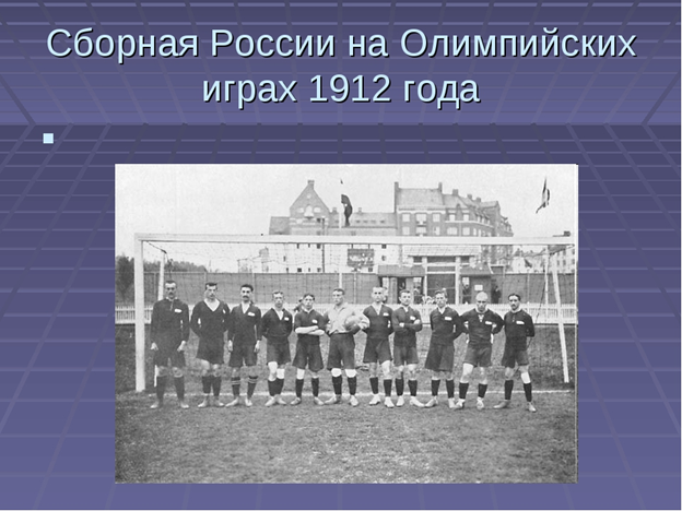 Сборная России на Олимпийских играх 1912 года В Стокгольме на новом построенном стадионе 5 мая 1912 года состоялось торжественное открытие пятой олимпиады. Олимпийский футбольный турнир проходил с 19 июня по 5 июля. В турнире приняло участие одиннадцать команд. Сборная России по футболу впервые принимала участие в Олимпийском турнире. В январе 1912 года был образован Всероссийский Футбольный Союз. Союз объединил футбольные структуры Москвы, Санкт –Петербурга, Одессы, Киева и других городов России. Сборная России должна была выступить на первом для себя крупном международном турнире, на Олимпийских играх. Российский футбольный союз не организовал должной подготовки сборной. Руководство Московской и Петроградской футбольных лиг долго спорили между собой: чьим футболистам играть в сборной. Каждая из лиг считала своих футболистов сильнейшими. Было даже предложение выступить на Олимпиаде двумя командами, однако ФИФА не допустило участие двух команд от одной страны. Футболисты из других горо