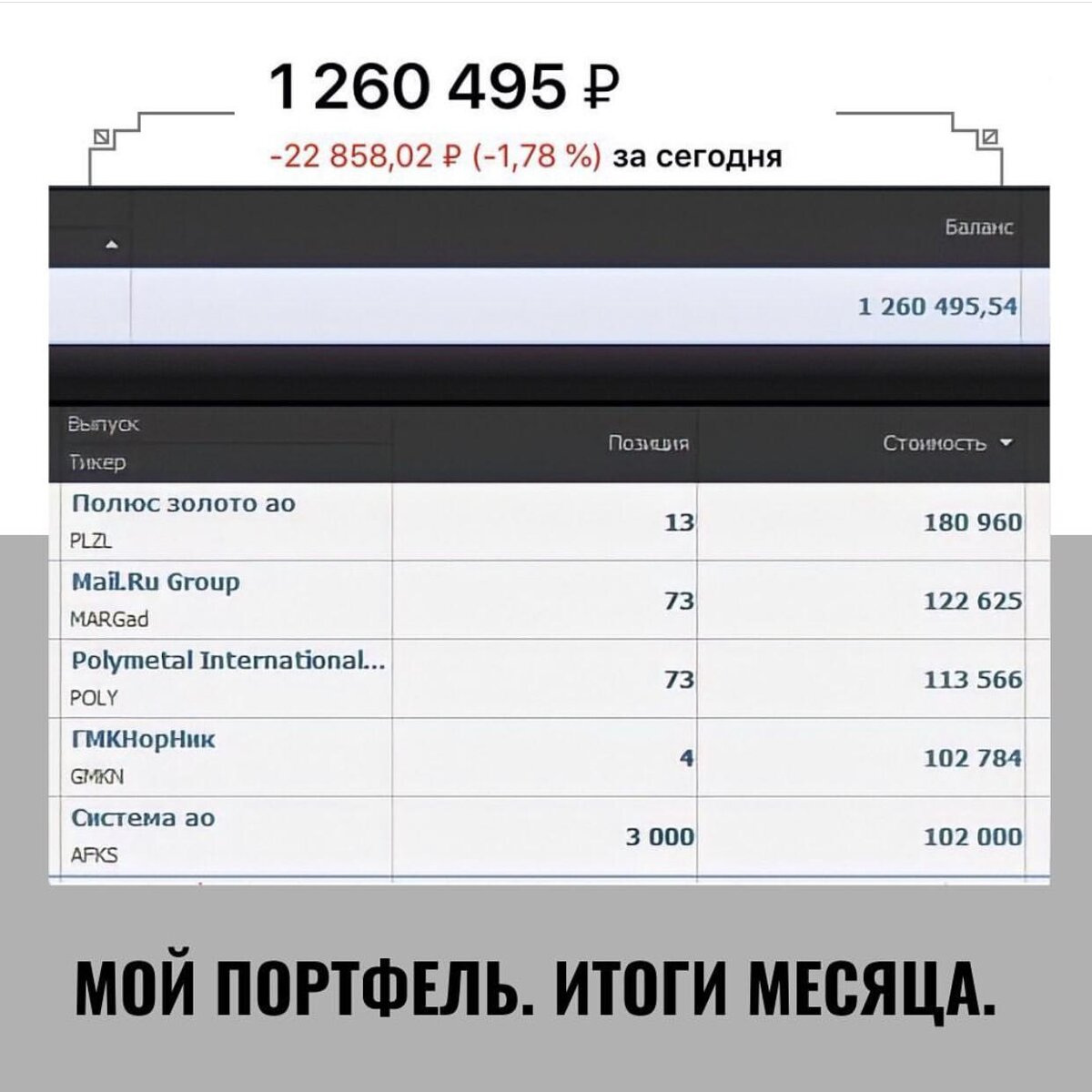 +1,61 % за апрель или +20 000 рублей. Считаю доходность каждый месяц для чистоты эксперимента, так как докладываю на счет деньги каждый месяц. Затем в конце года плюсую результаты по каждому месяцу и получаю годовую. Средняя годовая пересчитывается каждый год в конце года по результатам лет, в течении которой я придерживаюсь своей стратегии инвестирования. Средняя годовая сейчас +45%. Теперь по портфелю. Месяц был очень интересным. В этом месяце я успел и купить Полюс, и продать его, и опять купить. По Норникелю тоже разгружался недавно. Да вообще в целом , как вы помните во второй половине месяца почти ничего не брал, а даже, наооборот, немного продавал. Как видите , не зря. Меня как то спросили, зачем так заморачиваться, если можно просто ETF на индекс Мосбиржи купить. Спросили, потому что не видели хорошего падения. Но сейчас сами все поймут. Портфель растет когда рынок растет. И вроде зачем заморачиваться. Но вот когда рынок падает- портфель также растет. Не быстро, не ловлю никаки