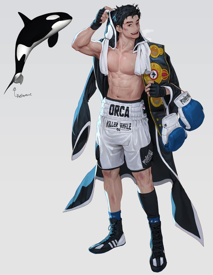 Бескрайняя фантазия корейского художника, известного в сети под ником Ринотуна, помогает ему рисовать настоящие аниме шедевры. Вдохновение, черпается художником, из любого предмета окружающего его, даже из обычного бутерброда, птицы, фотоаппарата или рыбы возникает образ персонажа, который, как будто только сошел с экрана аниме. Аниме — это японская мультипликация. В отличие от детских мультиков, к которым мы все привыкли, это направление мультипликации рассчитано скорее на взрослую и подростковую аудиторию. Персонажи аниме отличаются характерной манерой рисовки персонажей, погрузившись в эту культуру, и посмотрев несколько аниме мультфильмов, вы уже никогда не перепутаете обычного мультяшного персонажа и анимешного. Этот парень, нарисованный по образу касатки, пожалуй смог бы занять достойное место в топе самых привлекательных мужских персонажей из фильмов аниме. Глаза героев аниме рисуются как правило большими, художник старается наложить как можно больше красивых бликов и полутоно