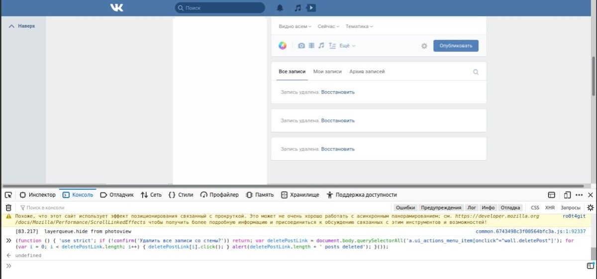 Причин для удаления записей со стены в ВК очень много, но администрация об этом не позаботилась и не предоставила подобный функционал обычному пользователю. Можно вручную удалять все записи, но если их очень много, то данный способ не подойдет. Есть и другие способы очистки стены ВК, например: 1. Зайдите в раздел "Моя Страница". 2. Пролистайте вниз, пропустив часть записей. 3. Нажмите правую кнопку мыши. 4. Выберите пункт "Посмотреть код". 5. Переключитесь на вкладку "Консоль". 6. Скопируйте код ниже: (function () { 'use strict'; if (!confirm('Удалить все записи со стены?')) return; var deletePostLink = document.body.querySelectorAll('a.ui_actions_menu_item[onclick^="wall.deletePost"]'); for (var i = 0; i < deletePostLink.length; i++) { deletePostLink[i].click(); } alert(deletePostLink.length + ' posts deleted'); }()); 7. Вставьте в консоль и нажмите "Enter". 8. Подтвердите удаление записей, нажав "Ок". Подписывайтесь на наш канал: https://t.me/vol_pod