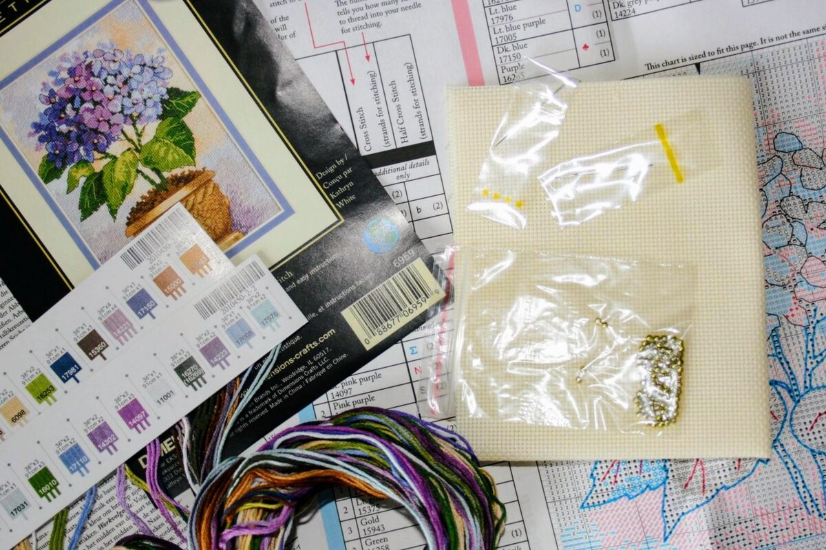Всем большой вышивальный привет! Сегодня я хочу подвести вышивальные итоги за апрель 2021 года. Точнее, как за апрель - наверное немножко марта в этих итогах тоже есть. Вообще была у меня задумка публиковать статьи о том, что вышила, ежемесячно, но то настроения нет, то вдохновения, а то и не вышивала толком...В общем, планирование- не мой конек! Последние итоги были за февраль в этой статье И потом тишина...😃 А я вышивала! В этом году зима была холодной и снежной, а весна затяжной. До сих пор у нас на улице +5, +7 градусов и в домах еще топят, а на улице серо и совсем немного зелени..А я соскучилась по ярким краскам. Поэтому весной я ударилась в вышивку цветов! Для меня это нетипично - начинать столько цветочных сюжетов, я вообще цветы вышиваю в очень умеренных количествах раз в несколько лет, но, видимо, понадобилась мне все- таки активная цветотерапия. И первый цветочный набор, который я начала еще в марте - это старый добрый Dimensions арт. 06959 "Гортензия в горшке" или еще