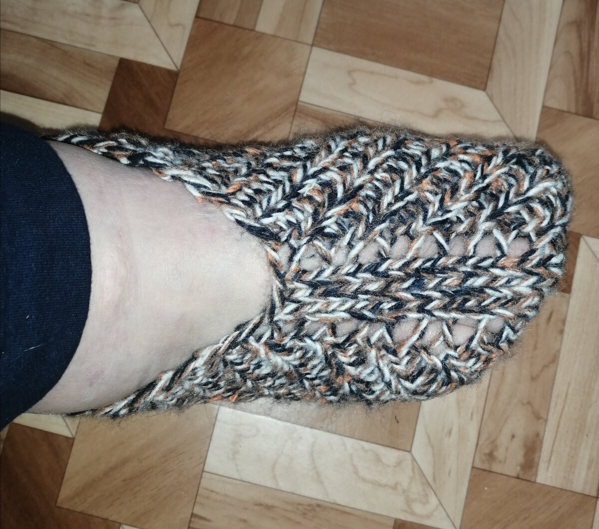 Дома я хожу в самовязанных тапочках-следках. Мягко, удобно, нигде не жмёт. Связать такие очень быстро и просто, за два вечера это я с запасом времени взяла, там и за один уложиться можно. Вот так выглядят на ноге: А вот новая пара в запасе: Работа очень простая, на двух спицах. Пряжа пестренькая у меня такая, с вайлдбериз, там разные цвета есть, и однотонные тоже: Это я для теплого времени акрил взяла, а для зимних шерсть запасла, вот такую, но не связала ещё : Итак. Для 38-39 размера набираю 35 петель. Первый ряд - 16 петель резинкой 1х1, затем накид, 3 петли изнаночными, опять накид и еще 16 петель резинкой 1х1. Кромочные тоже считаю в эти 16 петель Второй ряд-17 петель резинкой 1х1, 3 петли лицевыми и опять 17 петель резинкой 1х1. То есть накиды провязываю по схеме резинкой. Третий ряд - уже по 17 петель резинкой, посередине 3 изнаночные и также 2 накида около них. Повторяем так ряды, пока не получится 11 рядов с дырочками от накидов. Или приложите, достаточно ли вам такой глу