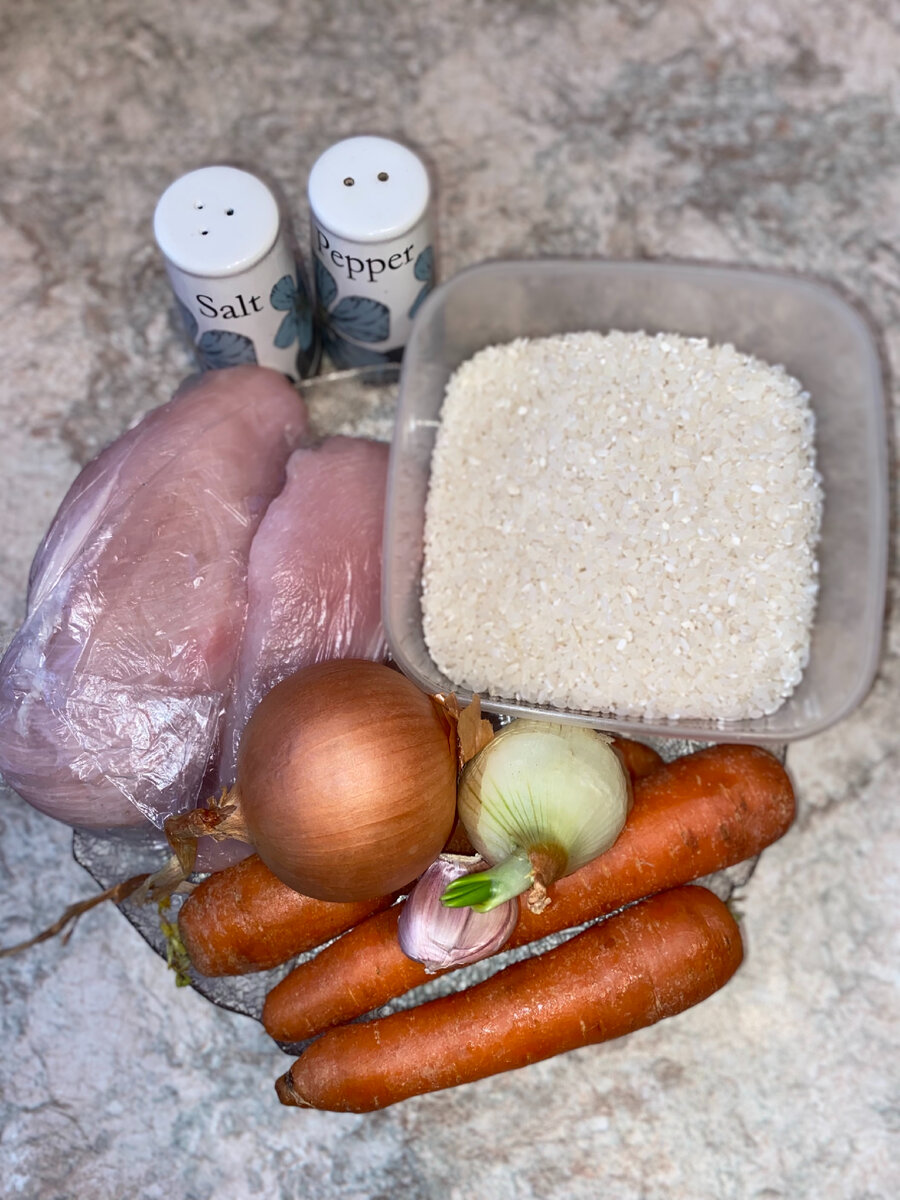 Рецепт ароматного блюда из доступных продуктов. Из указанного количества ингредиентов получается 10-12 порций. Ингредиенты: Питательная ценность: Шаг 1 Лук нарезать мелко. Морковь натереть на крупной тёрке. Шаг 2 Филе помыть и нарезать небольшими кусочками. Шаг 3 Обжариваем лук, добавить морковь, обжариваем немного. Добавляем филе, жарим 20 минут. Добавляем тертый чеснок, перемешиваем, убираем с огня. Филе с овощами выкладываем в форму для запекания. Шаг 4 Рис помыть в холодной воде, Выложить в форму, разровнять, посолить немного, поперчить. Залить горячей водой, 2-3 см., что бы покрывало рис. Запекаем в духовке при 180 градусах 40-50 минут.