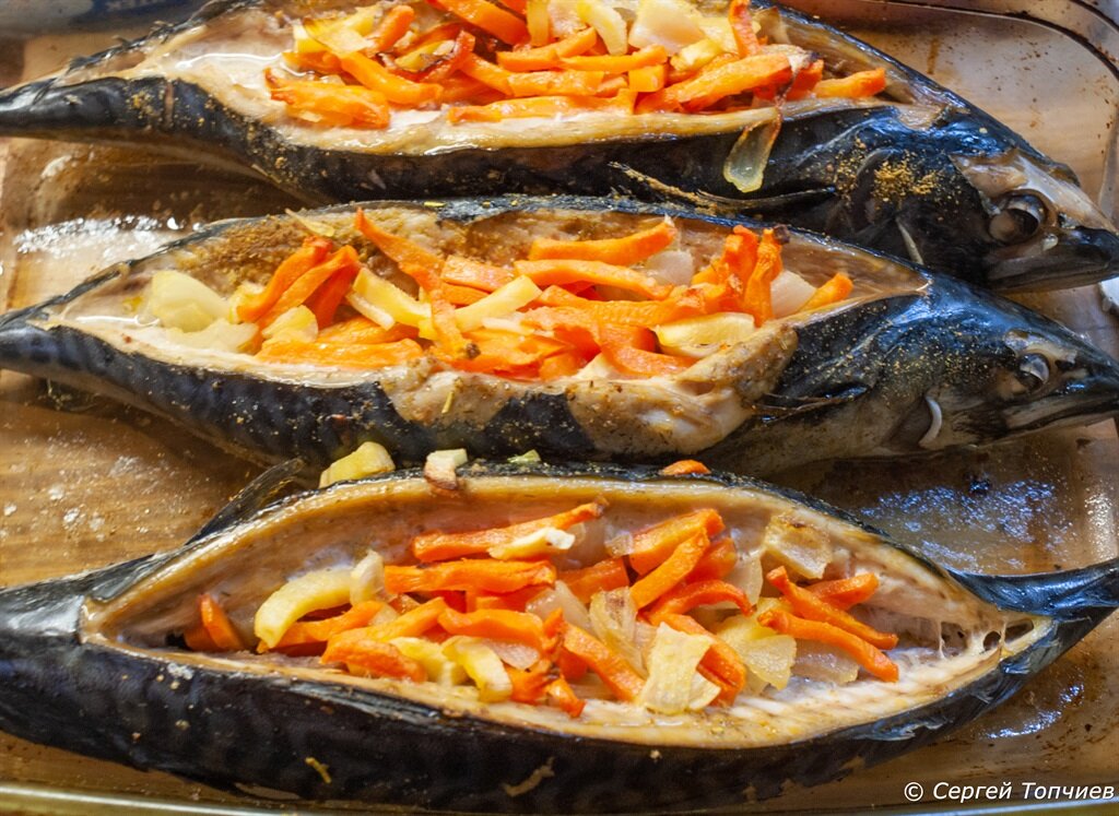Скумбрия, запеченная в духовке с морковкой и белым корнем. Просто, вкусно и полезно