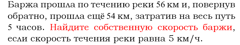 Пусть Х - собственная скорость баржи. Если баржа плывет по течению реки, то ее собственная скорость увеличивается на скорость реки, и наоборот. Все данные из задачи перенесем в таблицу.