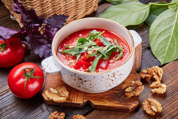 Освежающий холодный томатный суп с абхазскими помидорами, базиликом, сельдереем и эстрагоном. Рецепт от шеф-повара московского ресторана «Арго» Игоря Маматова. ИНГРЕДИЕНТЫ Помидоры в собственном соку 250 г Чеснок 3 г Базилик 2 г Стебель сельдерея 5 г Соль 2 г Молотый черный перец ½ г Помидоры 60 г Эстрагон 5 г Оливковое масло 10 мл Грецкие орехи 5 г ИНСТРУКЦИЯ ПРИГОТОВЛЕНИЯ 1. Обжарить на оливковом масле чеснок, фиолетовый базилик, стебель сельдерея, залить томаты, добавить соль и перец, проварить в течение десяти минут. 2. После этого протереть массу, выложить в тарелку. 3. Мелко нарезать абхазские помидоры, добавить к содержимому, украсить листьями свежего тархуна и грецким орехом. Еще больше рецептов на сайте eda.ru
