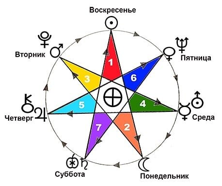 Значение семиконечной звезды настолько велико, что довольно часто её используют в самых различных гаданиях. С помощью гадания семиконечная звезда вы можете определить доминирующие планетарные энергии в определенный день недели (ДР человека, важного события),узнать перспективы на ближайшие семь дней, понять, что вам желательно предпринять, а чего следует избегать, к чему расположен каждый день, какими могут быть последствия тех или иных ваших поступков. Гадание следует выполнять в воскресенье, которое соответствует Солнцу (Sunday, sun - солнце). Это у нас принято начинать с понедельника, а раньше во многих традициях начинали с воскресенья. Ведь день, связанный с солнцем - это хорошее начало для творческого развития, движения вперед, демонстрации своих лучших качеств. Идём по оси вниз к Луне (понедельник - Monday, moon - луна). Почему не советуют начинать с понедельника? Так