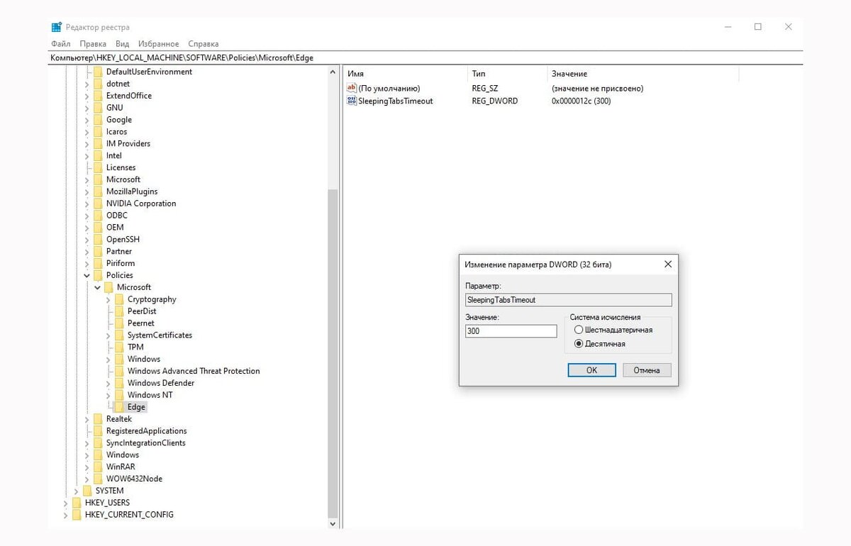 По умолчанию в браузере Edge неактивные вкладки переходят в режим ожидания через 2 часа, но в выпадающем списке настроек можно выбрать и другое время бездействия — от пяти минут до шести часов. Данные параметры настраиваются в разделе настроек Система -Сохранение ресурсов. Функция тем хороша, что высвобождает занимаемые вкладками ресурсы процессора и оперативной памяти, тем самым позволяя направить их на более актуальные в данный момент нужды. Если на вашем ПК присутствуют еще учетные записи, то вы можете задать общее время для перехода вкладок в спящий режим. Для этого откройте Редактор реестра и перейдите по пути: Компьютер\HKEY_LOCAL_MACHINE\SOFTWARE\Policies\Microsoft\Edge. Если подраздел Edge отсутствует, то создайте его. Далее создайте параметр DWORD (32 бита) с именем SleepingTabsTimeout. В качестве значения этого параметра установите число в десятичной системе счисления, равное количеству секунд, по истечении которых неактивные вкладки будут переходить в режим «гибернации» у вс