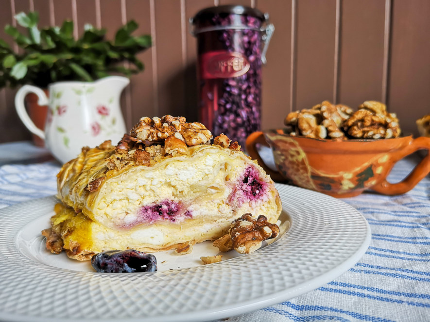 Затем в получившуюся массу добавить ягоды и ваниль. Ягоды бывают самые разные - черника, черника, малина, клубника. Еще немного перемешайте и разложите по лавашу, затем перекрутите. Намазать взбитым яичным желтком, посыпать толчеными орехами и поставить в разогретую до 180 градусов духовку. Через 20 мин. ваш чудесный десерт уже будет дымиться на столе. Очень вкусно!