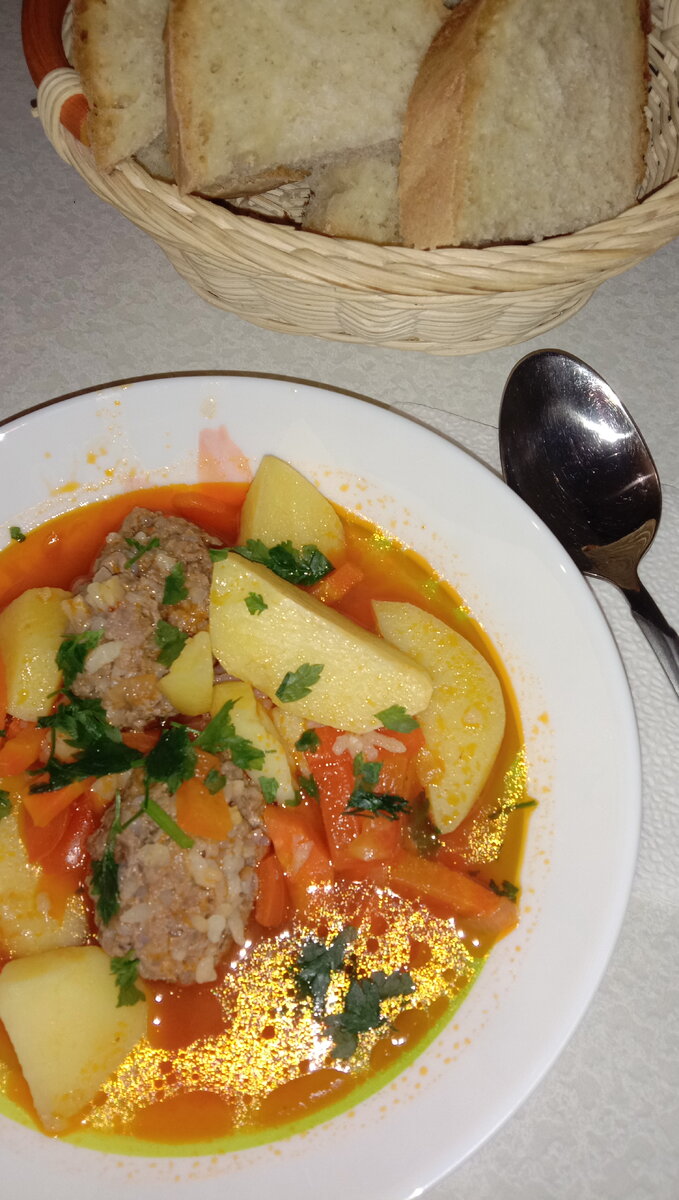 Хочу поделиться с вами очень простым и вкусным блюдом. А главное его приготовление сведено к минимуму. Его можно приготовить как на обед, так и на ужин. Нам понадобится: - Лук, морковь, болгарский перец, томаты (можно заменить томатной пастой) - Мясной фарш, любой на ваш вкус - Рис сырой-для фарша - Картофель - 5 шт. - Зелень - Соль, перец по вкусу Крупно режим лук, морковь и болгарский перец. В разогретый казан наливаем подсолнечное масло и обжариваем овощи. Далее кладем томатную пасту или нарезанные томаты. Тушим пару минут, добавляем крупно нарезанный картофель и заливаем водой Пока закипает вода, формируем тефтели из фарша и риса. Вода закипела, добавляем тефтели. Соль и перец по вкусу. Тушим до готовности картофеля и риса. Подаем со свежей зеленью. Приятного аппетита!