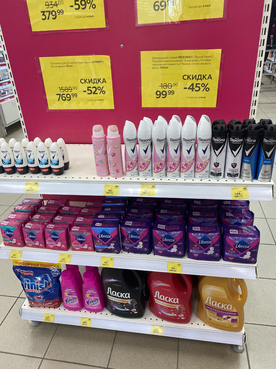 "Магнит косметик" - это магазин косметики, бытовой химии и товаров для дома. Каждую неделю здесь обновляются средства по скидкам. Поэтому всегда можно выбрать момент и приобрести товар с выгодой для своего кошелька. В данном обзоре вы сможете увидеть цены на ассортимент, скидки котого действую до 4 мая. Это в основном товары с полочки ниже, но на акции другой продукции это не распространяется. Дезодорант рексона. Чем я люблю шариковую продукцию, тем что их хватает на большой промежуток времени. С учетом скидки в 46% цена: 79,99 ₽ Так же есть антиперспирант в другом варианте. Тут уже линейка с различными запахами. Скидка 44% 99,99 ₽ Честно говоря я не сторонник дезодорантов с сильным ароматом, который перебивает духи или просто запах чистой кожи. Всегда выбираю что-то нейтральное. Не забыли и про мужские средства гигиены. Зашита от запаха пота до 48 часов. Скидка немного меньше - 40% 149,99 ₽ Редко встречаю людей, которые богаты на посудомоечную машинку. Но все равно принято, что в