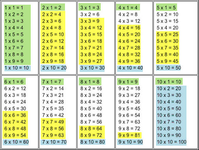 В последнее время изучение таблицы– это один из самых популярных запросов от родителей учеников начальных классов, обращающихся ко мне за помощью, как к репетитору. В этой статье рассказываю, какие методы изучения таблицы умножения использую со своими юными подопечными. 1. Учим блоками («лесенкой»). Выписываем первый блок, таблицу на 2. Все примеры выделяем, они для нас новые. Когда приступаем к изучению таблицы на 3, уже выделяем на один пример меньше, так как этот пример изучили в таблице на 2. В таблице на 4 уже учим на 2 примера меньше, и т.д. Когда ребёнок видит, что каждый раз количество примеров не такое большое, как представлялось изначально, страх перед таблицей уменьшается. Также отдельно отмечаем примеры с умножением на единицу, проговаривая, что при умножении на единицу число не изменяется, а также примеры с умножением на 10, отмечая, что при умножении на 10 к первому множителю приписываем ноль. Рекомендую перед изучением показать сводную таблицу, где всё наглядно представ