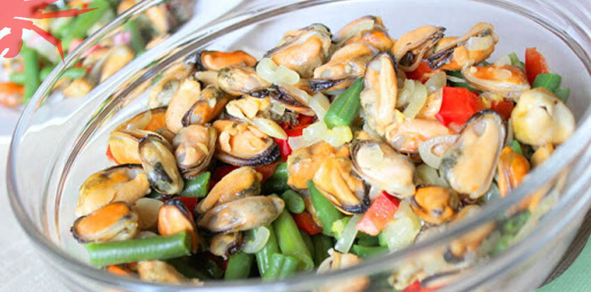 Ингредиенты: Размораживаем мидии: перекладываем с морозильной камеры в холодильник на бумажное полотенце. Затем промываем их под проточной водой. Берем кастрюлю с водой, доводим до кипения, солим и кладем фасоль, варим 5 минут. Затем сливаем воду и обдаем фасоль холодной водой. Далее очищаем лук от шелухи и нарезаем его. Берем сковороду, разогреваем оливковое масло, обжариваем лук и добавляем мидии. Жарим 5 минут, после чего добавляем лимонную цедру и сок. Нарезаем болгарский перец. Берем салатник, кладем в него фасоль, перец, обжаренные мидии с луком, поливаем оливковым маслом. Блюдо готово. Приятного аппетита! Источник: https://wildcrab.ru/news?id=1073
