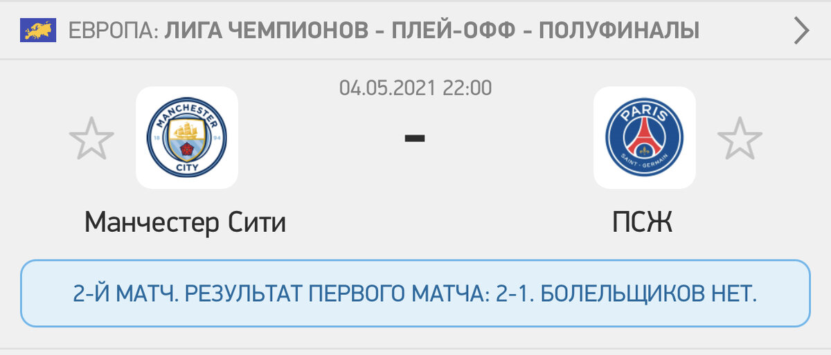 Сегодня в рамках ответного полуфинального матча нынешнего розыгрыша Лиги Чемпионов встретятся Манчестер Сити и ПСЖ. Что же ждать от этого матча ? Манчестер имеет двойное преимущество . Во-первых в счёте , вторых в отличии от ПСЖ решили вопрос с чемпионством во внутреннем первенстве , отсюда и наверняка лучше сконцентрированы на ответную игру . Моё мнение то , что Манчестер с первых минут отдаст владение бело-голубым и будет пытаться выходить в быстрые контратаки , что у них хорошо получалось в первой встрече , но подводила реализация моментов . Что касается потерь: Также было под вопросом появление Киллиана Мбаппе , но накануне стало известно , что он все таки полетел в Англию .