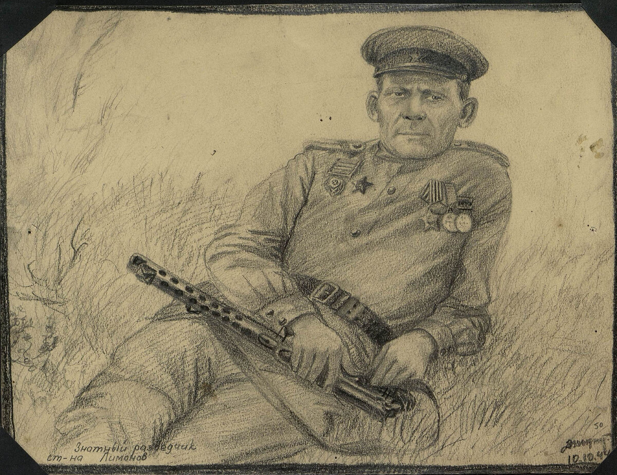 Расскажу вам историю одного героя, карандашный портрет которого я нашел на «Образах войны», в журнале боевых действий 173 сд. Вел его, видимо, хороший художник, потому что в журнале есть много рисунков – пейзажей, боевых иллюстраций и отдельных героев. Вот под этим рисунком, например, есть подпись «Знатный разведчик старшина Лимонов». Так он выглядел осенью 1944 года. Как видите, к тому моменту, Александр Иванович Лимонов заслужил «За отвагу», «Славу» III степени и «Красную Звезду». Он воевал с 1941 года. Отступал с Юго-Западным фронтом, дрался за Сталинград. Два раза был ранен, после излечения возвращался в строй. Был матерым, опытным бойцом. И интересно, что как и у многих, награды начал получать с 1943 года, когда фронт повернулся на запад. Первую свою медаль «За отвагу» он получил за переправу через Днепр и рейд разведчиков с целью выяснения обстановки. Кстати, он уже к этому моменту стал старшиной и командиром взвода разведки в отдельной разведроде 173 сд. До этого всех наград бы