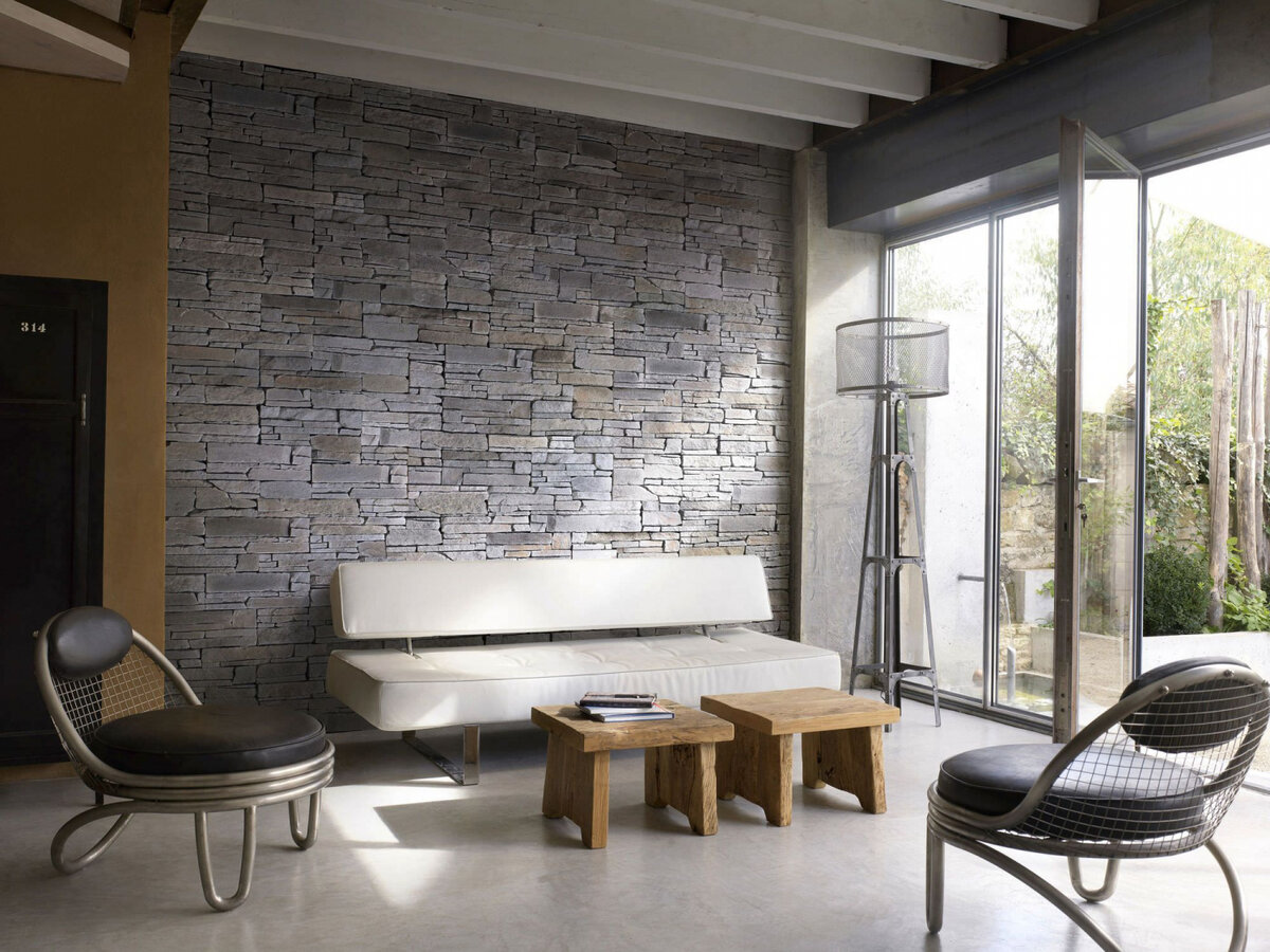 Существует выбор между шлифованным (гладким) или расколотым сланцем. Он отлично смотрится в деревенском стиле оформления (Рустик, к примеру), но его сложно мыть , учитывая его неровную поверхность. Таким материалом часто отделывают и стены.
