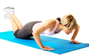Это женский вариант отжимания от пола. Его можно отнести к базовому упражнению. При выполнении данного упражнения задействованы локтевая мышца, большая грудная мышца, передний пучок дельтовидной мышцы, передняя зубчатая мышца.