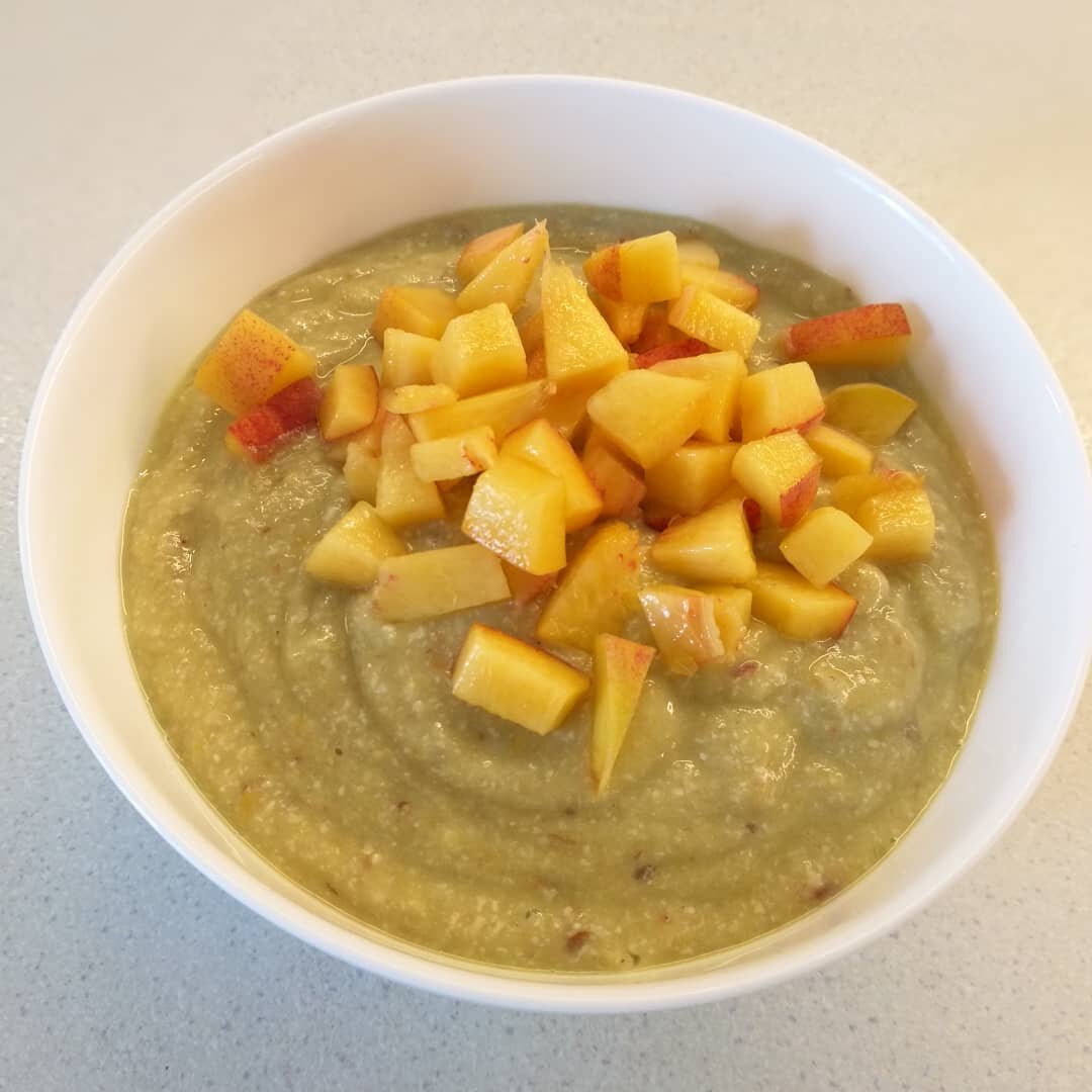 Когда есть возможность - готовлю вкусный и полезный завтрак из зеленой гречки. Как правило получается по выходным или когда работаю со второй смены. Сегодня как раз такой день ) Итак, на 1 порцию возьмем: 🍀 3 столовые ложки пророщенной зеленой гречки. 🍀 1 персик 🍀 0.5 авокадо 🍀 0.5 ч.л. заранее замоченных семян льна 🍀 50 мл. воды Все. Никакой там соли сахара –итак будет вкусно Приготовление: что-то режем, что-то так кидаем в чашу блендера, вжух-вжух 30 секунд и завтрак готов! Если на ваш взгляд каша выглядит тоскливо, то верху можно накидать немного кусочков персика – типа декор ) Все, можно завтракать с удовольствием) Мне очень нравится сочетание гречка + авокадо, потому, что второй ингредиент придает мягкость гречневым микро-крупинкам, которые сами по себе тяжеловато проглатываются. В комплекте с персиком создается фруктово-сливочный вкус и ложное ощущение, что это блюдо прошло термическую обработку. Каша немного сладковата на вкус и идет просто на ура ) Если кто-то п