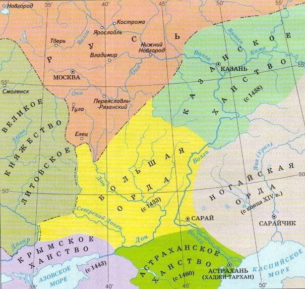 После распада Золотой Орды в начале XV века, начали образовываться следующие постордынские политические образования: Кроме этого, образовались две орды - Большая и Ногайская. Это была по сути конфедерация ордынских политических образований. Главным среди них был тот, кто назывался Тахт-Эли, то есть ханский престол. Это звание переходило от Большой Орды к Астраханскому ханству, затем к Крымскому ханству, которое впоследствии именовало себя Улуг Улус (Великий Улус). В 1460 году, хан Большой Орды Ахмат смог на некоторое время остановить процессы децентрализации и объединить большинство улусов под своей рукой. Он стремился к восстановлению Золотой Орды в прежних её границах и позиционированию ее как международного политического и торгового центра. Но против него образовалась коалиция Крымского ханства и Московского государства, которые вместе смогли совместно отбиться от Большой Орды, во время "Стояния на Угре" 1480 года. В 1502 году, Большая Орда перестала существовать и пальму первенства